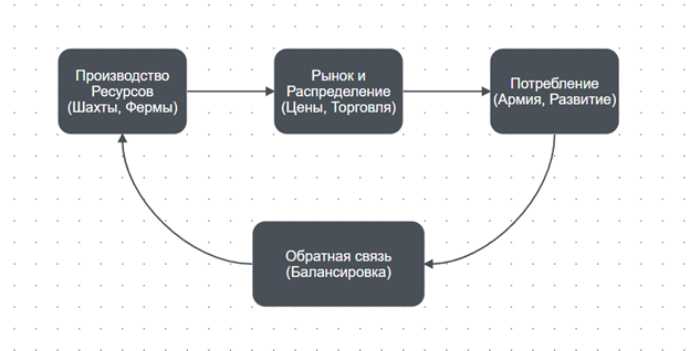 Для создания базовой экономической модели был выбран метод циклического баланса ресурсов, хорошо зарекомендовавший себя в стратегиях реального времени [6]. Этот метод остается одним из основных способов проектирования игровых экономик благодаря своей предсказуемости для разработчика и понятности для игрока.